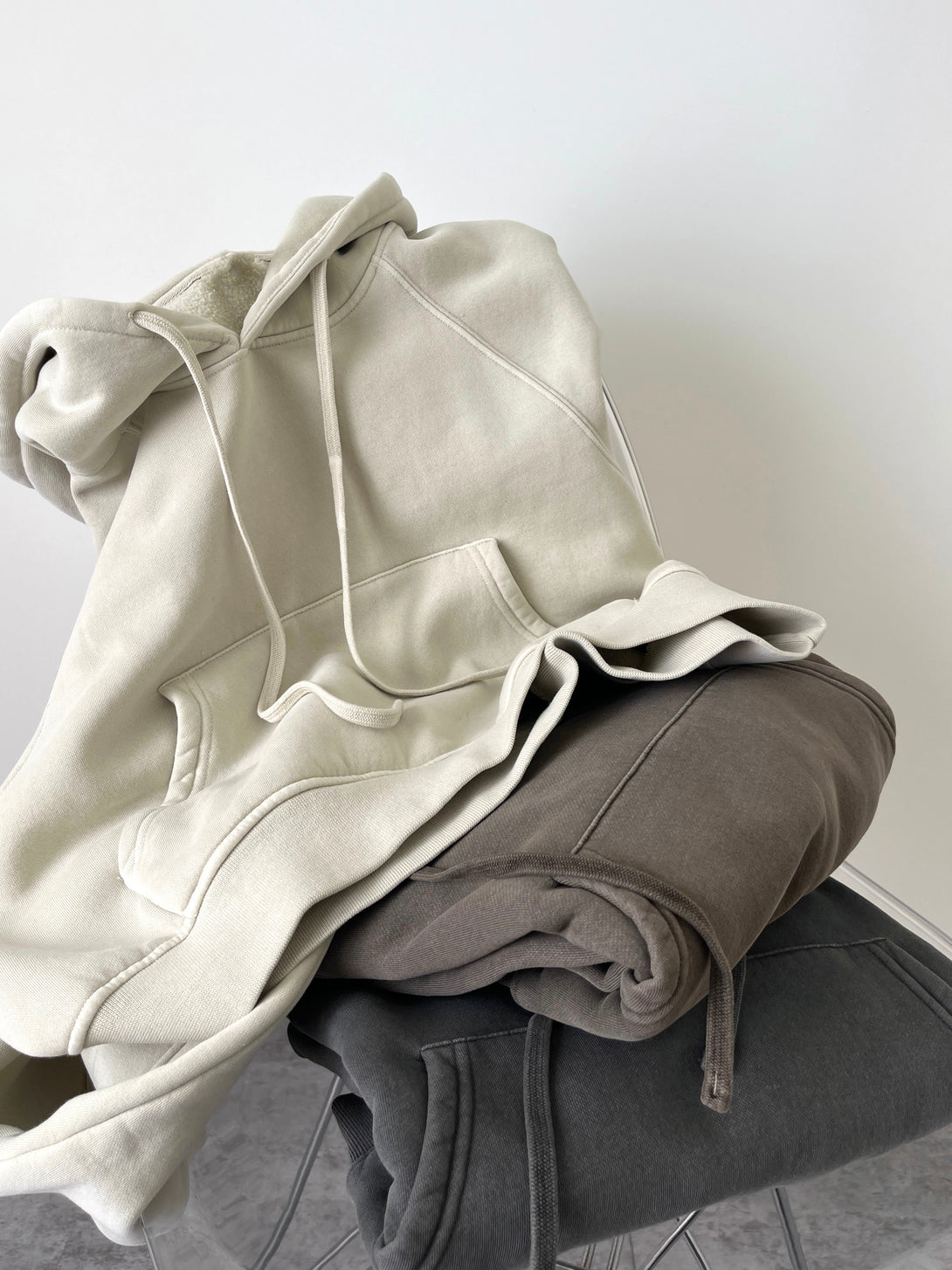 efuの大人気アイテム"VINTAGE SHORT HOODIE "からプルオーバータイプが登場。沢山の発売リクエストを頂き商品化したアイテムです。カジュアルの定番アイテムですが、ヴィンテージ加工を施すことで一気にお洒落な旬顔アイテムに。ヘルシーなクロップド丈でハイウエストパンツと相性が良く、スタイルアップが叶うシルエットに仕上げました。ハリ・コシのある厚みの裏起毛素材を使用しており、丸みのある立体的なシルエットが出ます。