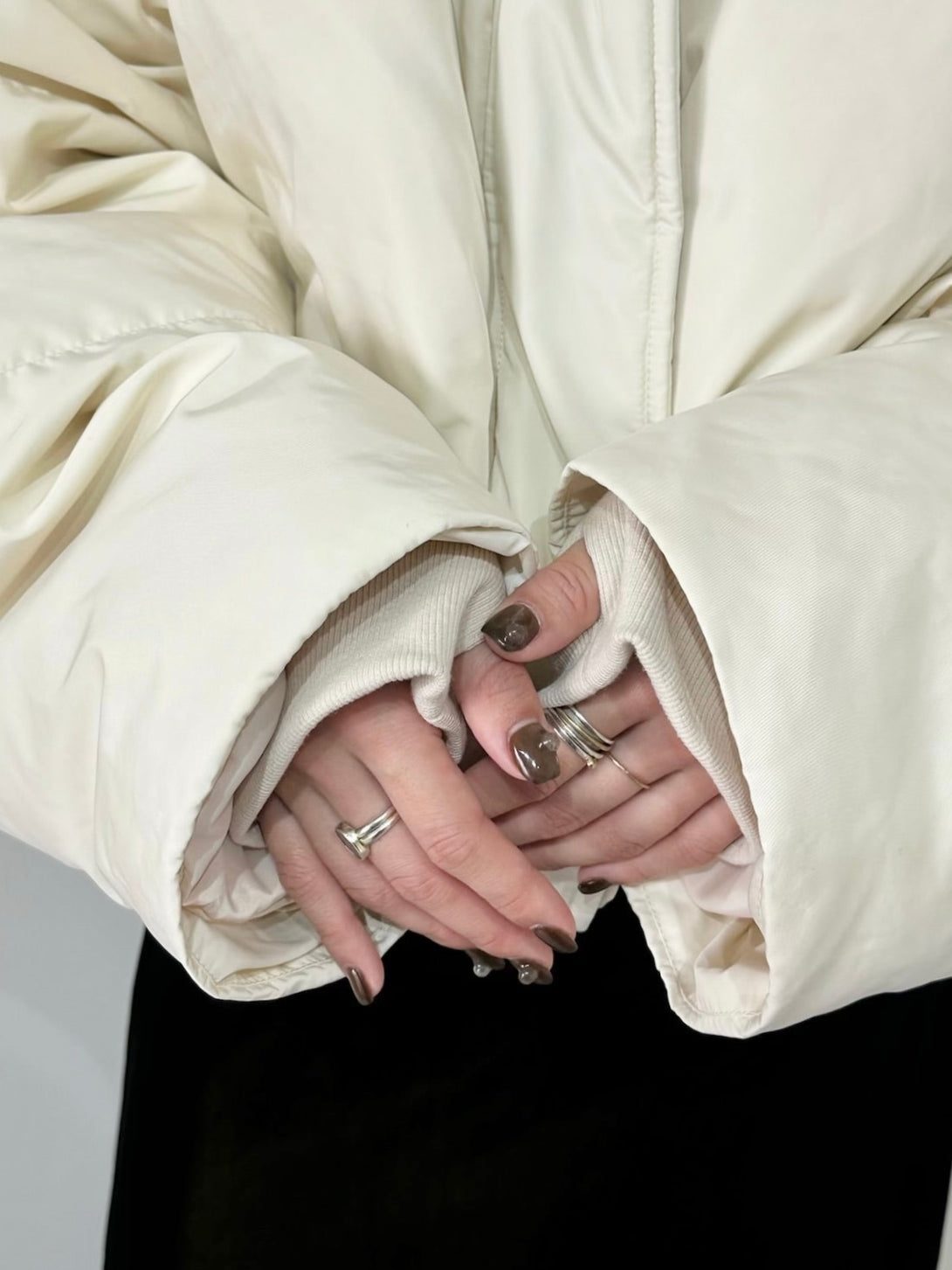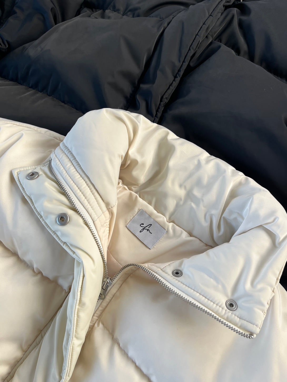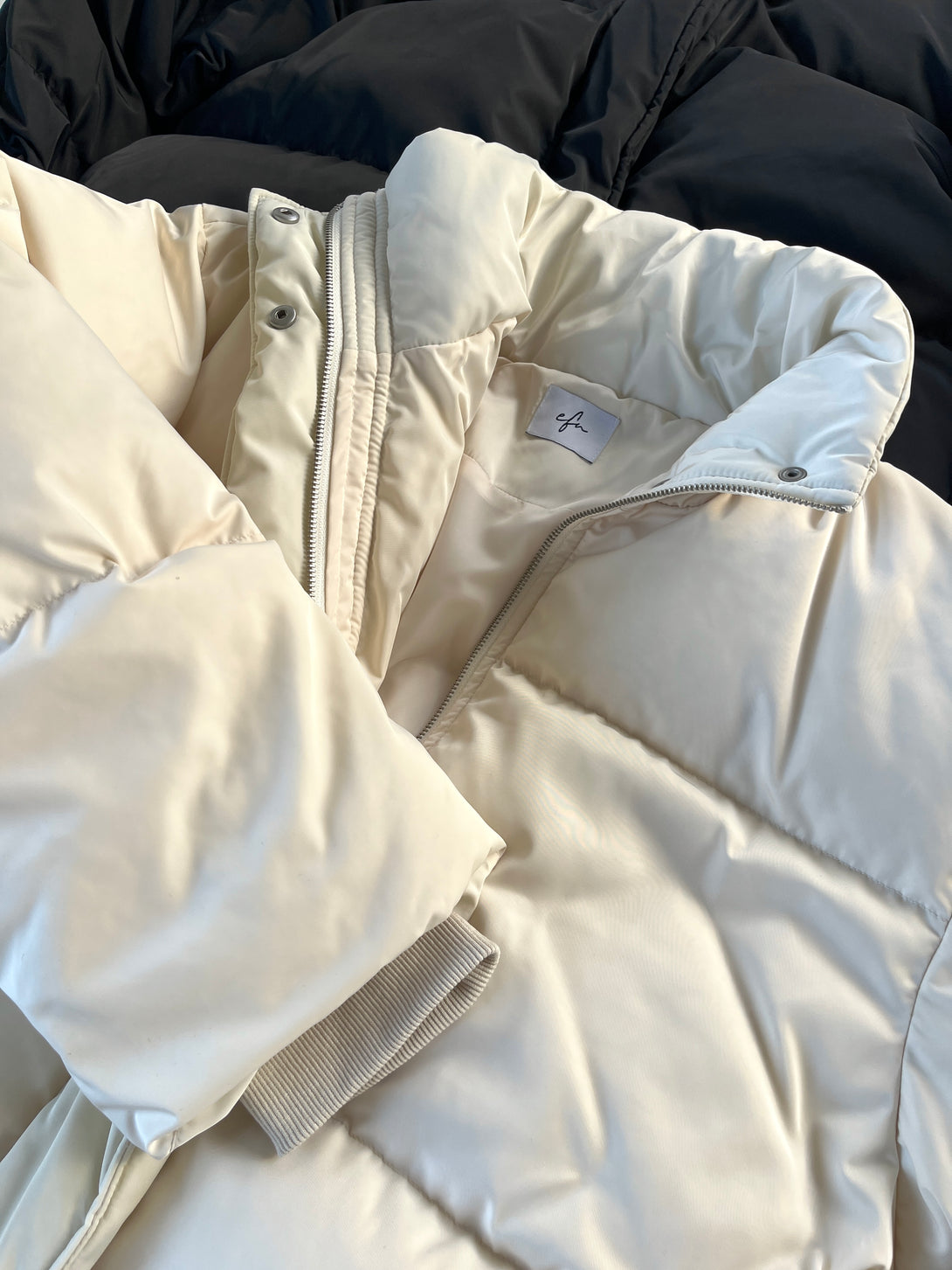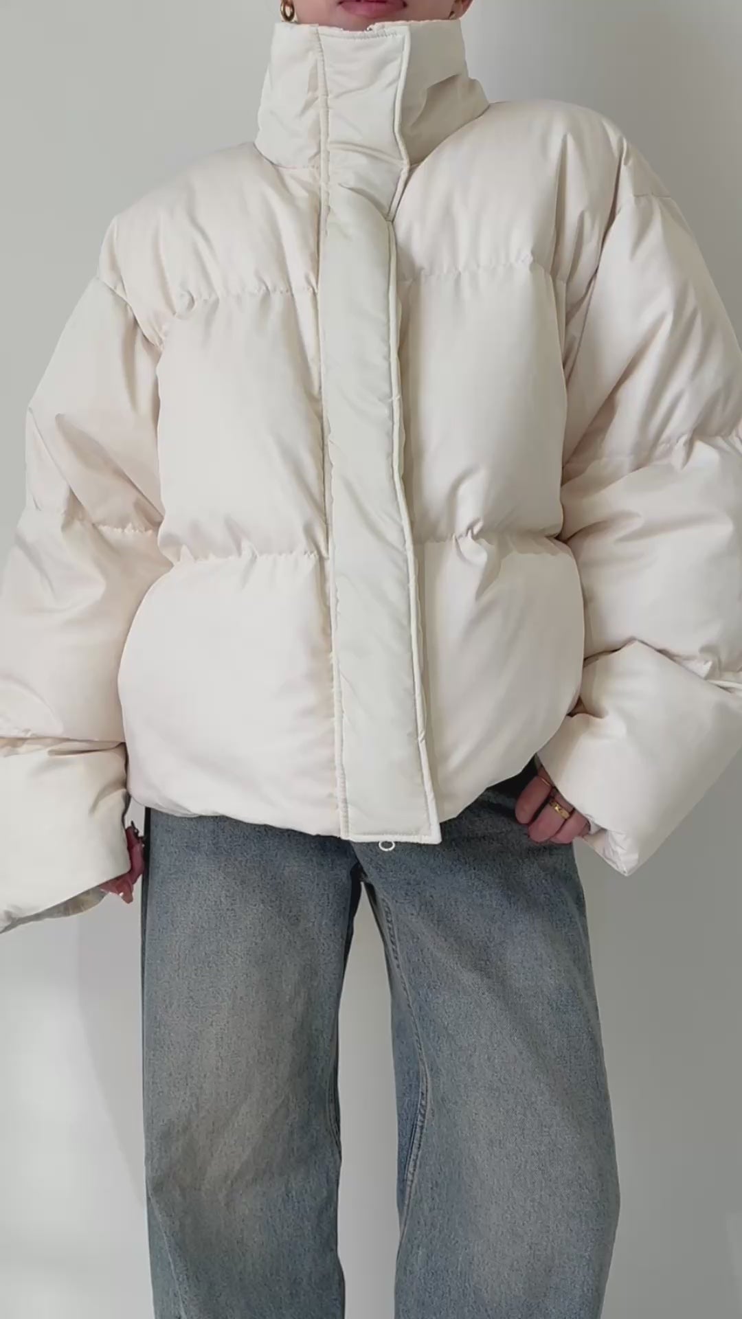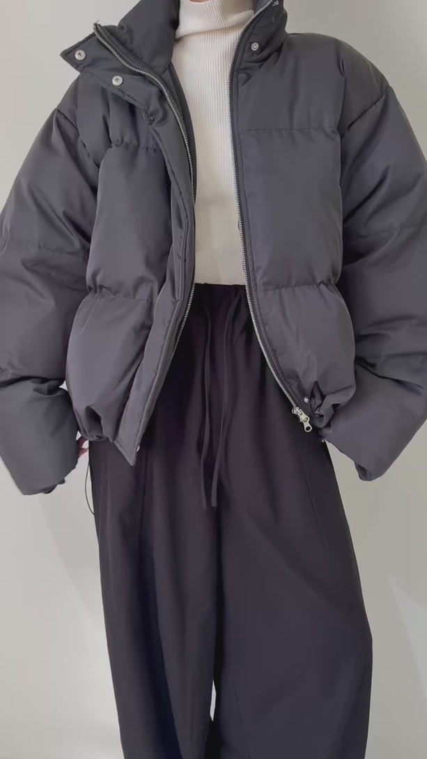 機能性とデザイン性を兼ね備えた、冬のマストハブアウター。ダウンとフェザーを使用し、軽さと暖かさを両立させたダウンジャケットです。程よいハリのあるマット素材を採用することで、カジュアルになりすぎず大人らしいムードに仕上げています。マフラーいらずで防寒性の高い首元デザインと、ボリュームスリーブがポイント。シンプルながらも存在感のあるデザインに。身幅や袖まわりにはゆとりを持たせているため、重ね着もしやすく快適な着心地。さらに裾のドローコードを絞れば、ショート丈のようなシルエットも楽しめます。気分やコーデに合わせて、お好みのバランスでご着用いただける一着です。