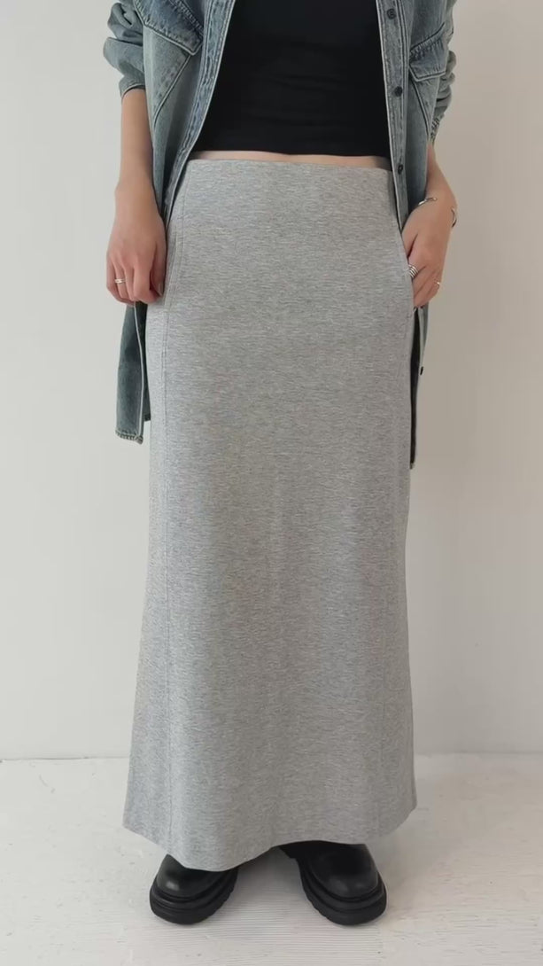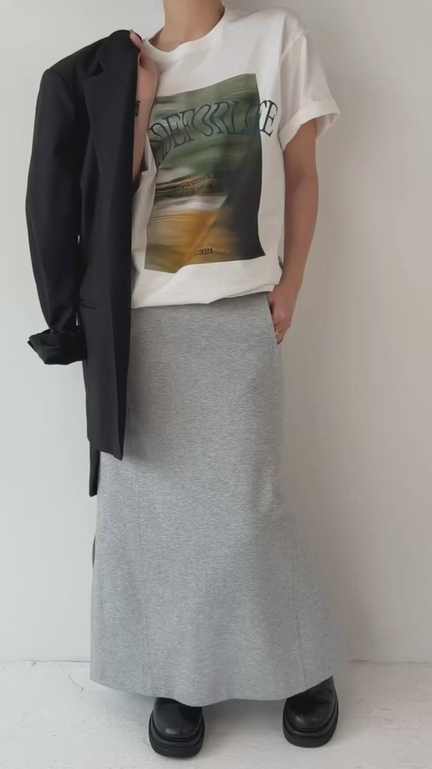 ラフなのに、どこか女性らしい。カジュアルなスウェット素材を、すっきりとした縦ラインのシルエットで大人仕様に仕上げたロングスカート。腰まわりはすっきり、裾にかけてほんのり広がるナチュラルなラインが体のラインを美しく見せてくれます。サイドにはスリットを入れ、抜け感と歩きやすさを両立。しっかりとした程よい厚みのある生地感で、身体のラインを拾いすぎないのもポイント。Tシャツ合わせでラフに、シャツやジャケットと合わせればモードな印象にも。デイリーに着たくなる、着心地とシルエットを両立した一枚です。