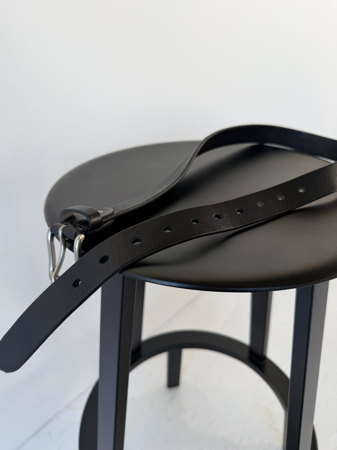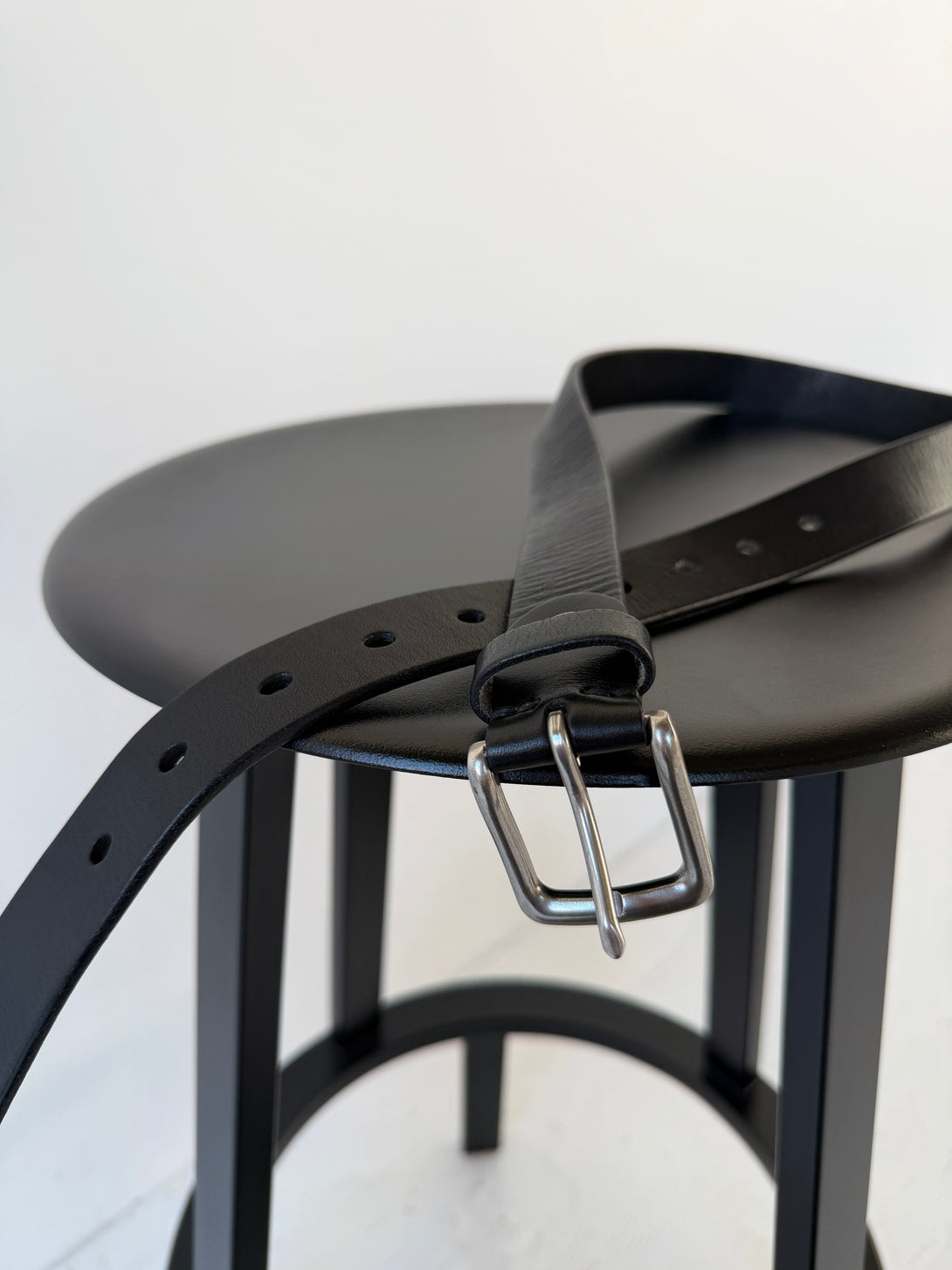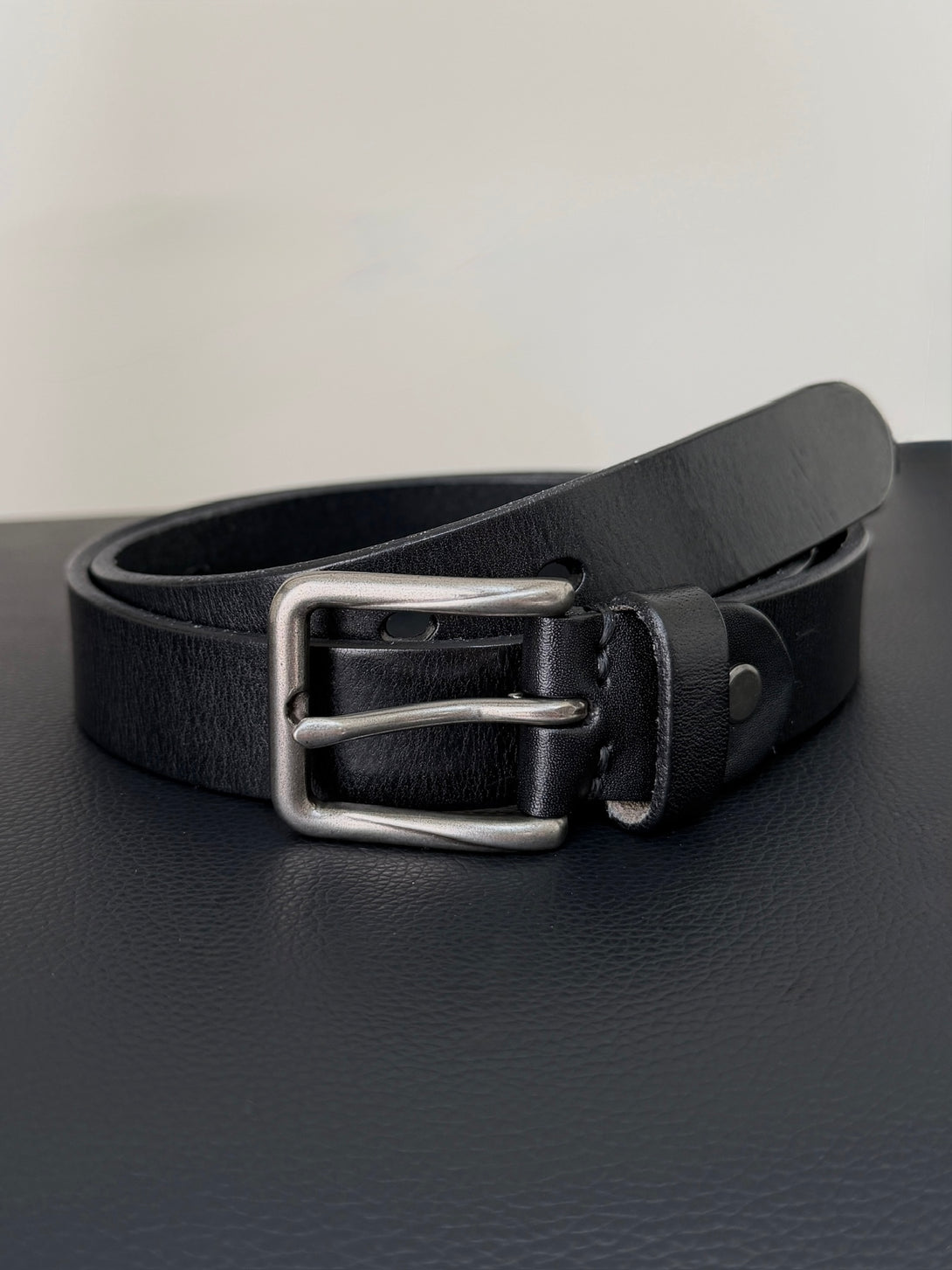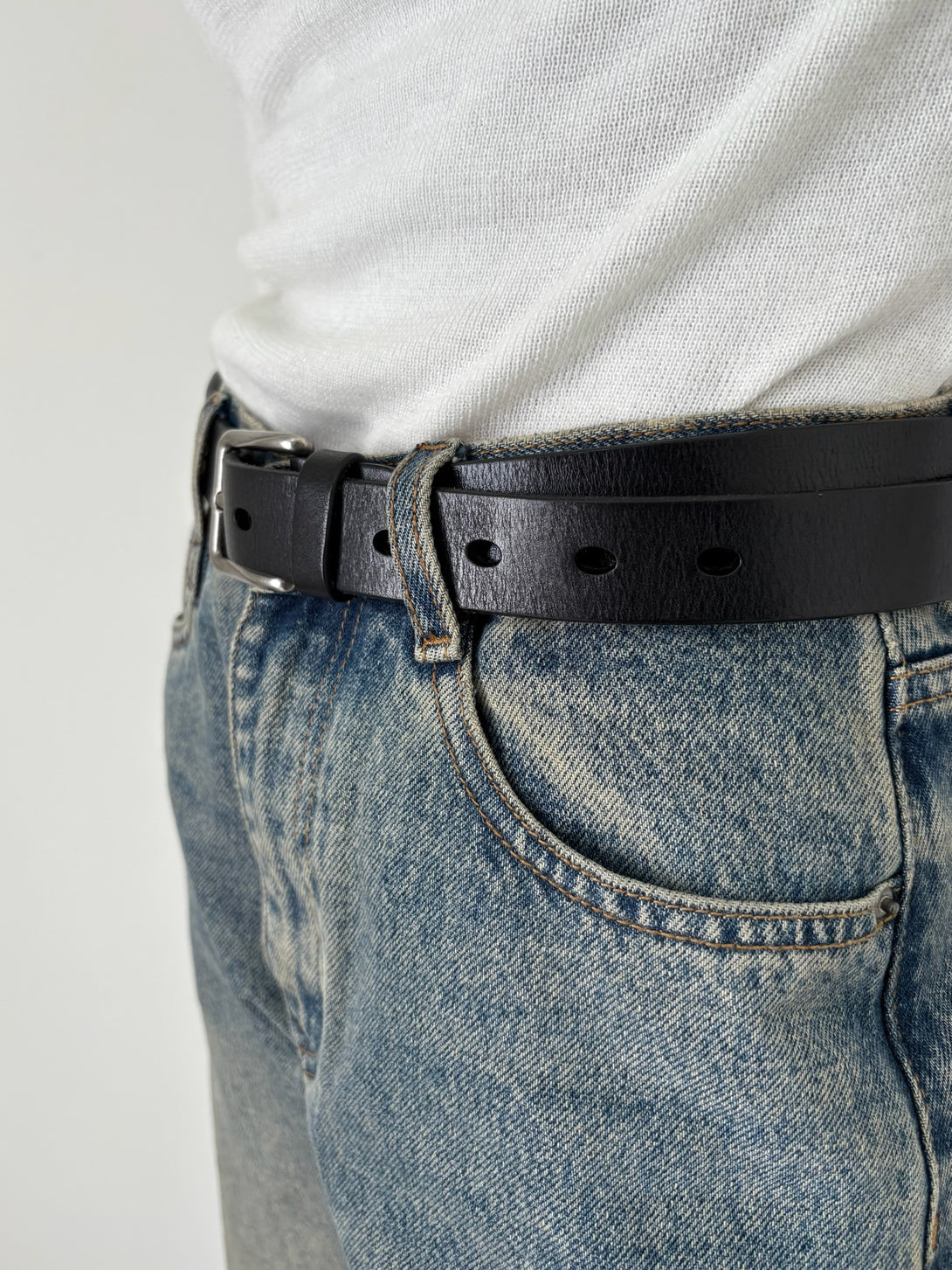 上質な牛革を使用した、ミニマルデザインのレザーベルト。25mm幅の細めの帯が、スタイリングにさりげないアクセントを添えてくれます。無駄を省いたシンプルな佇まいながら、レザー本来の風合いがしっかりと存在感を放つ一本です。ベルト穴は多めに設計しており、ハイウエストからローウエストまで幅広い位置でのサイズ調整が可能。コーディネートに品よく馴染みつつ、さりげなく引き締めてくれる万能アイテムです。