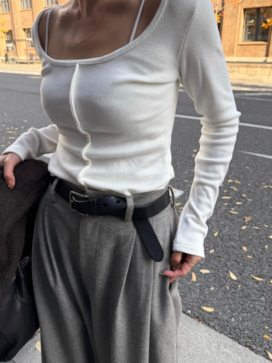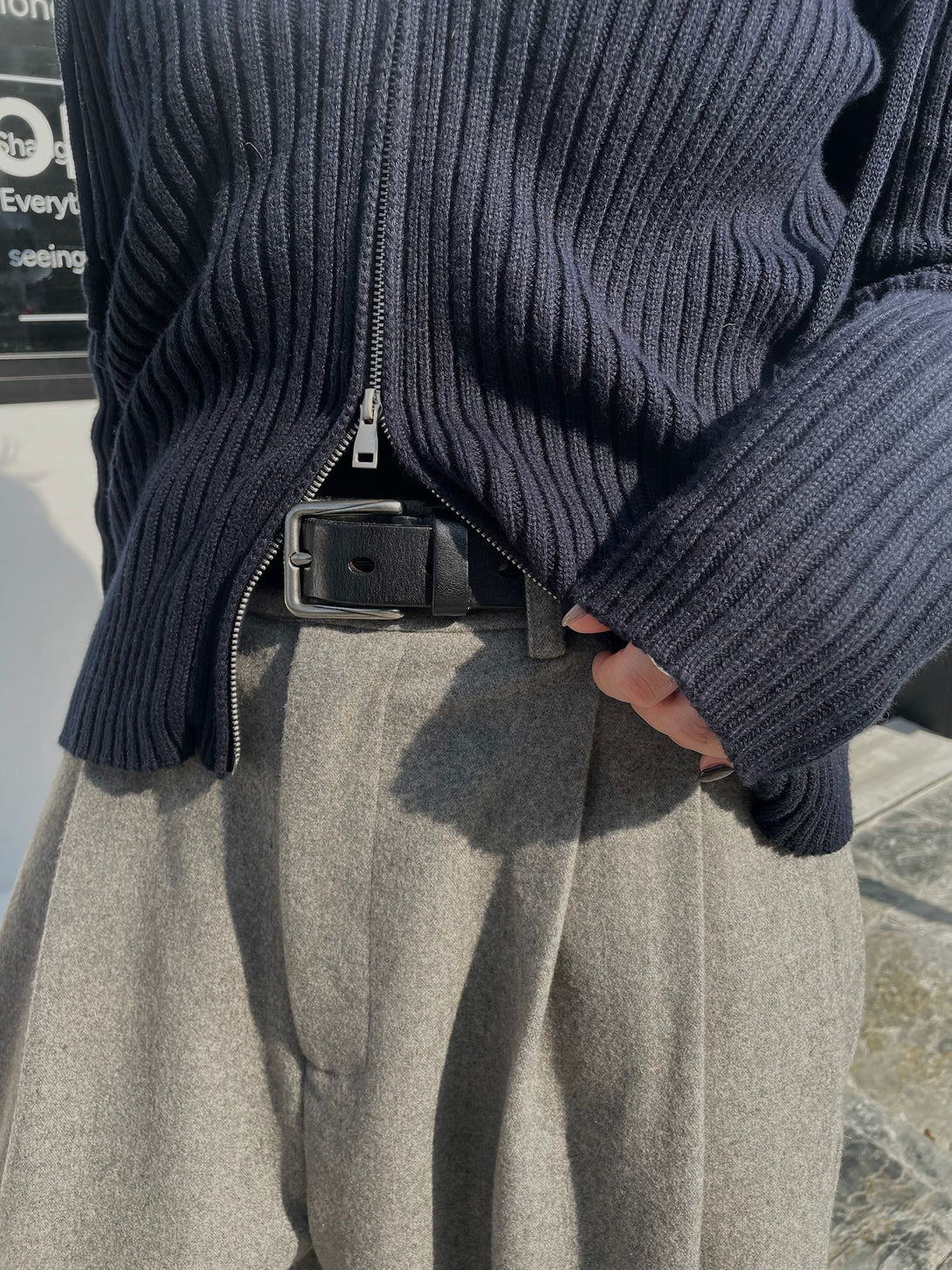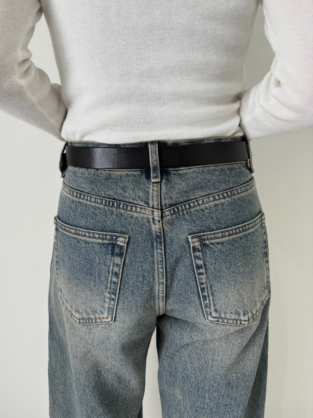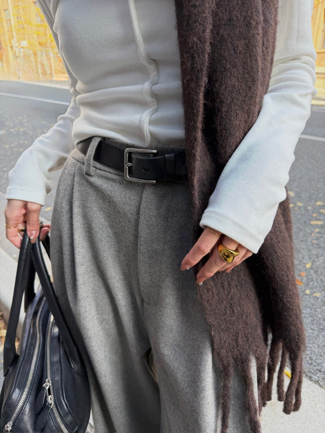 上質な牛革を使用した、ミニマルデザインのレザーベルト。25mm幅の細めの帯が、スタイリングにさりげないアクセントを添えてくれます。無駄を省いたシンプルな佇まいながら、レザー本来の風合いがしっかりと存在感を放つ一本です。ベルト穴は多めに設計しており、ハイウエストからローウエストまで幅広い位置でのサイズ調整が可能。コーディネートに品よく馴染みつつ、さりげなく引き締めてくれる万能アイテムです。