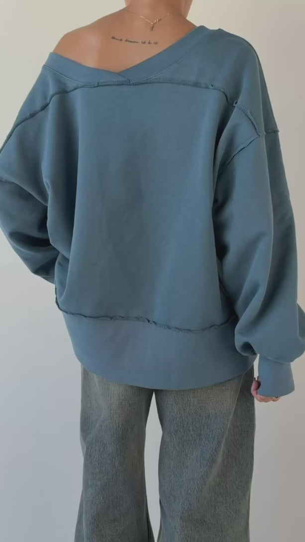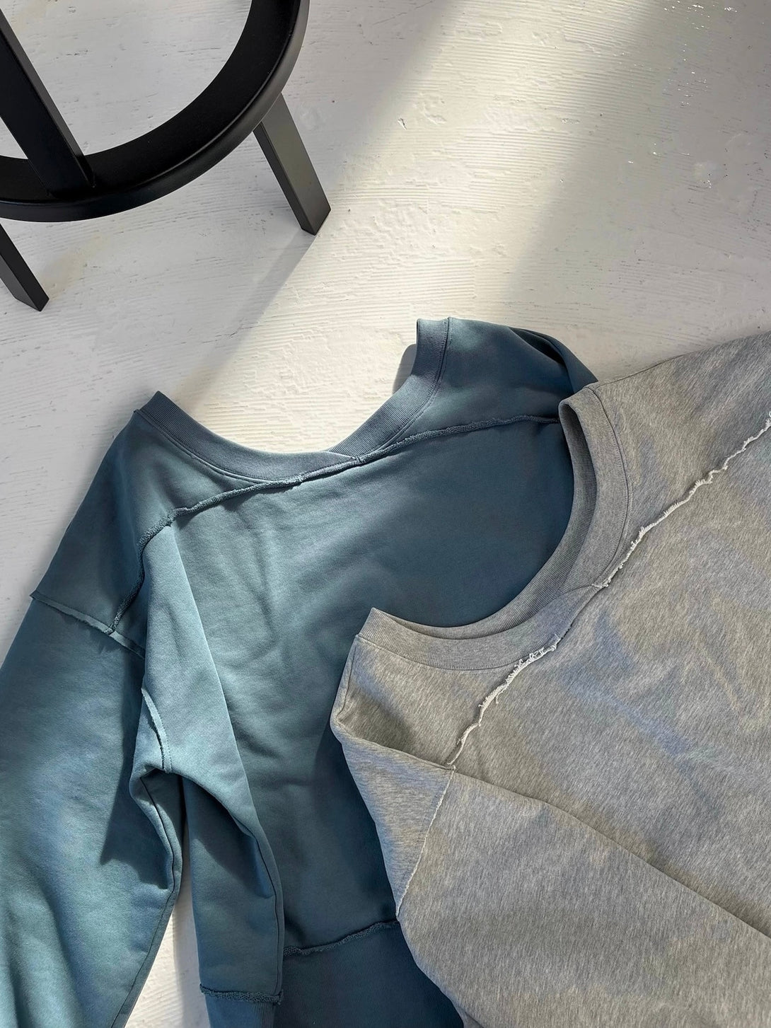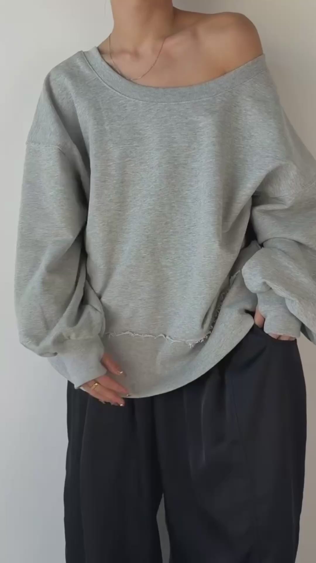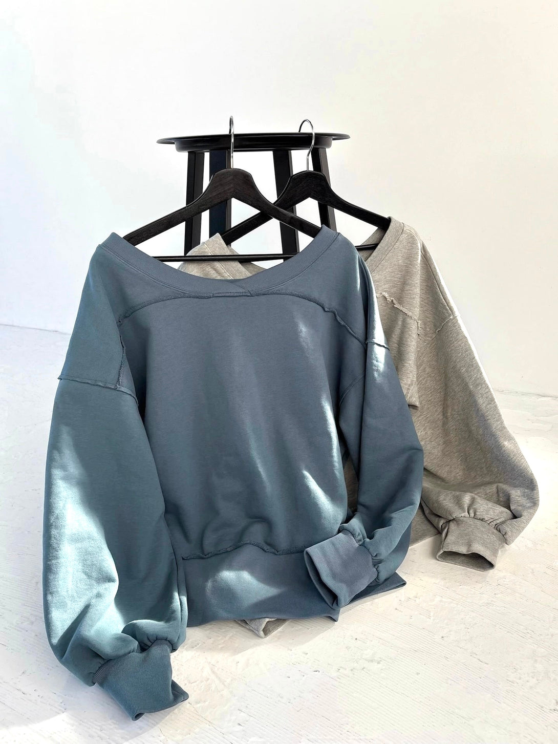 Vバックのデザインと、たっぷりと丸みをもたせたシルエットが魅力の、大人の抜け感を楽しめるラフスウェット。アウトリンキング仕様を取り入れることで、シンプルながらもこなれた表情に仕上げました。ボートネックのため、デコルテをすっきりと見せる着こなしはもちろん、ワンショルダーで抜け感をつくる着こなしも可能。自然に腰まわりをカバーしてくれる絶妙な丈感で、スカート・デニム・スラックスなど幅広いボトムスと相性抜群です。カラーはスウェットの定番・グレーと、efuが春に推すニュアンスのあるくすみブルーの2色展開。春のワードローブに加えておきたい、着回し力に優れた万能スウェットです。