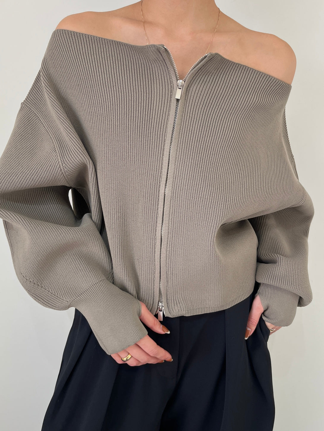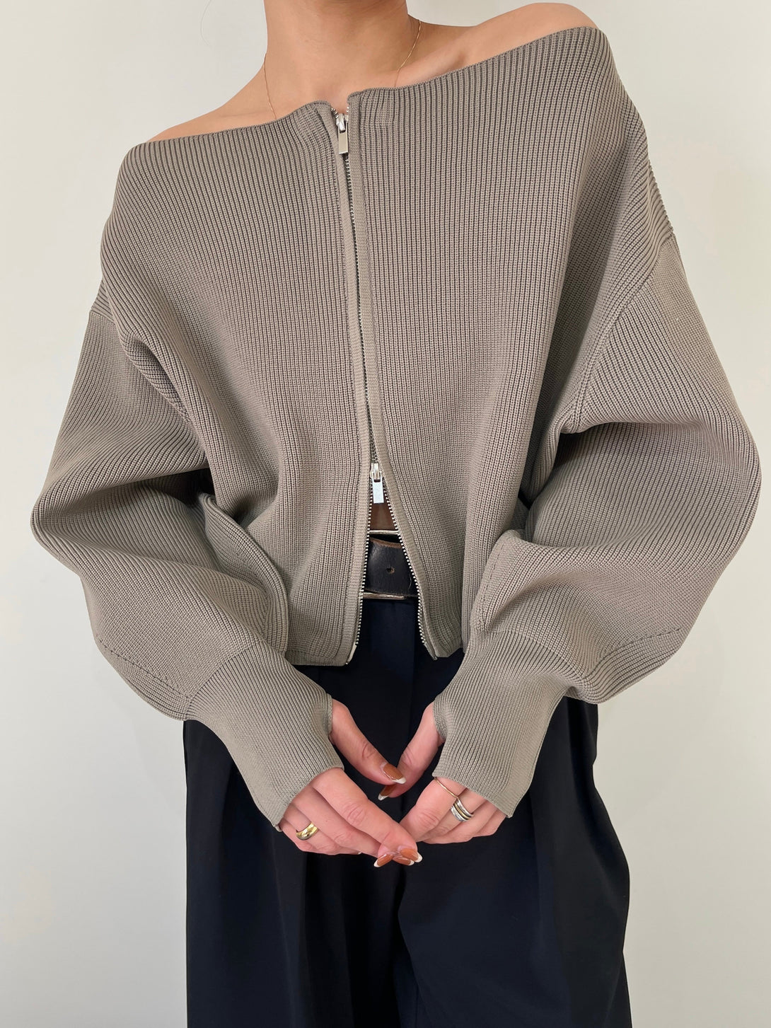デコルテラインが綺麗に見える、オフショルダーのスプリングニット。ジップがポイントで大人カジュアルな印象で着ていただける一着です。Wジップで、程よく開けると抜け感が出ます◎ すっきりとしたクロップド丈ですが、広めの身幅とボリュームのあるスリーブがルーズ感を演出。さらりとした軽い肌触りで、春にぴったりのニットです。